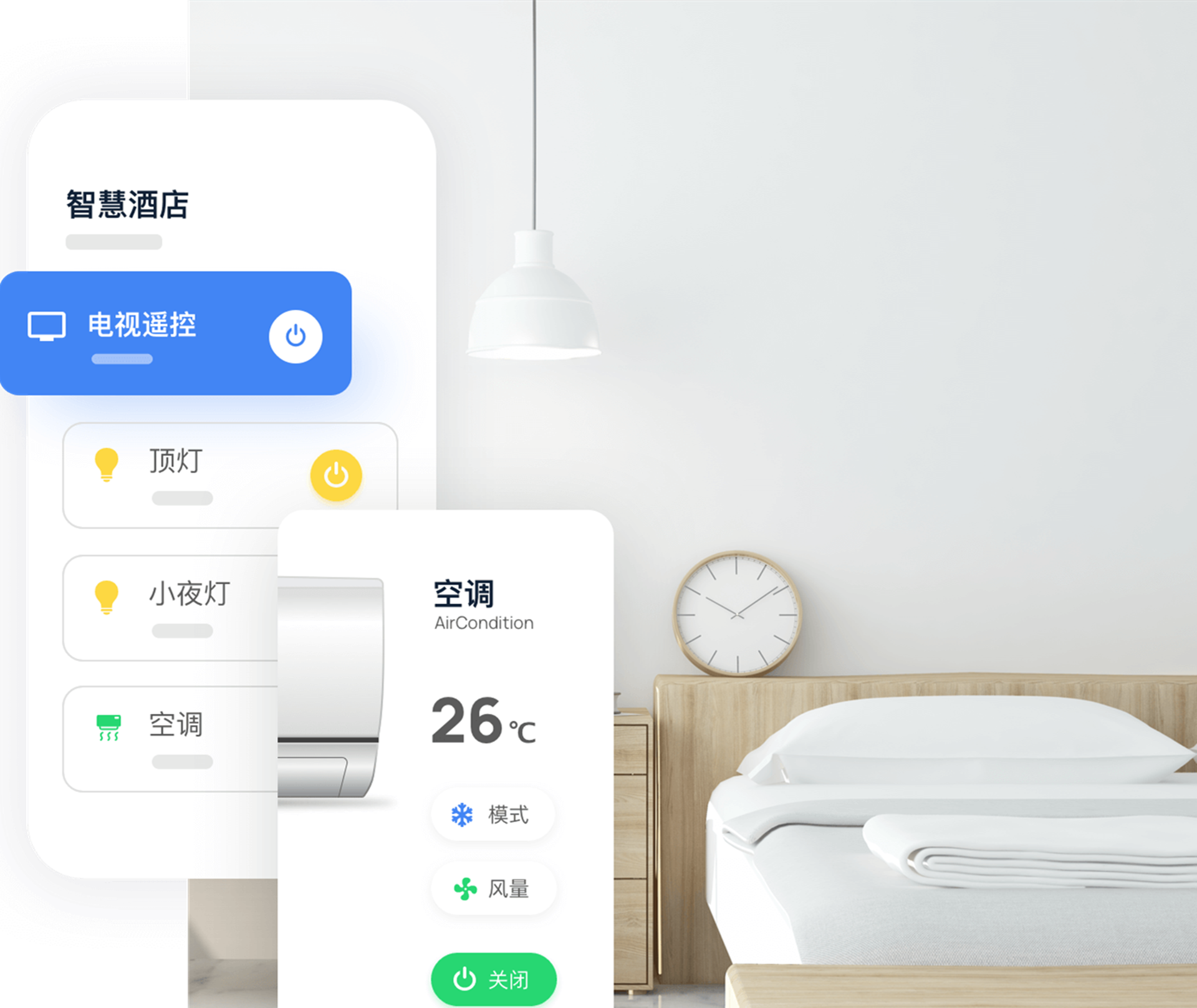 通过小程序/web app可以快捷开关客房中的设备,同时基于设备标准控制面板,可以对智能设备进行深度控制调节