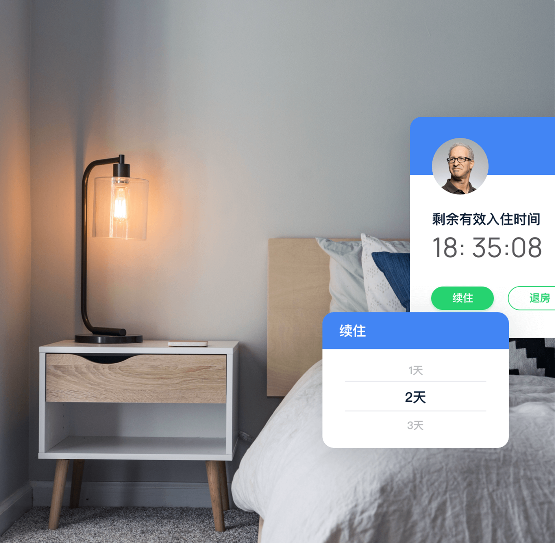 住客可以通过小程序/web app一键进行客房续住和预约退房,消息将会通过PMS通知酒店前台